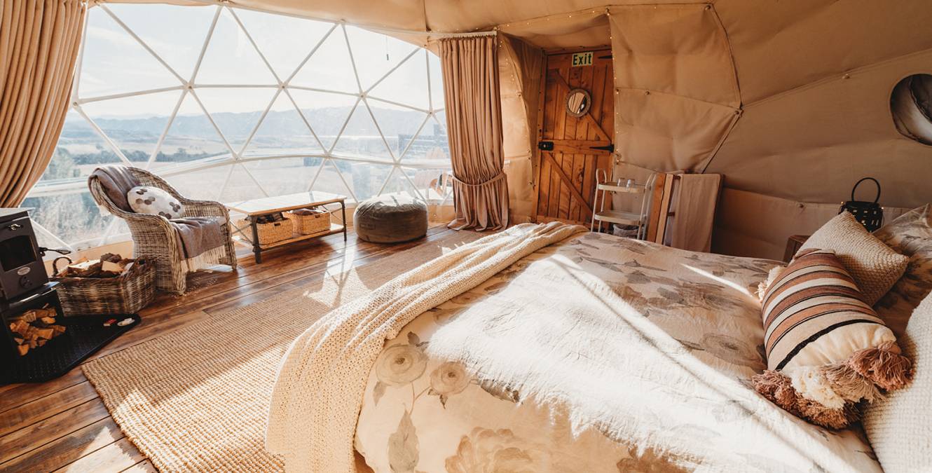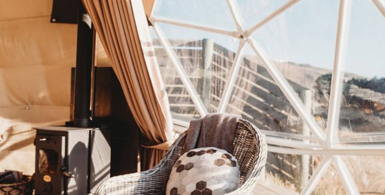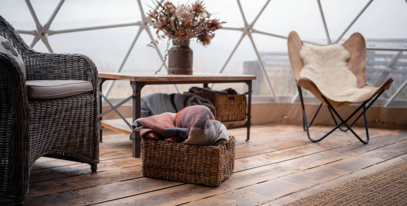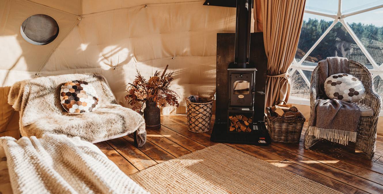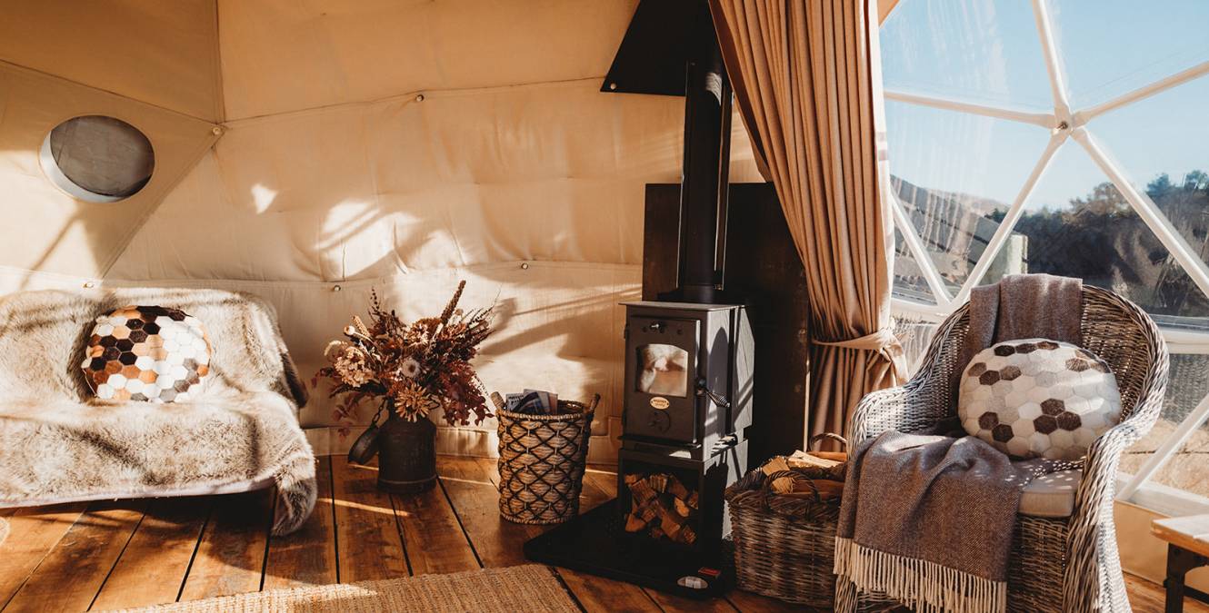This Geodesic Dome tent is 6 metres in diametre with a large bay window in front with private views of the stunning scenery. A super-king sized bed, with a luxury down duvet and linen duvet cover, pure woollen blankets, seating, bedside tables, lighting, cell phone charger, and a private balcony. Two fold out beds can sleep an extra 2 people. A small log burner for use during winter months (May to September) keeps the dome toasty warm. *Price includes breakfast*