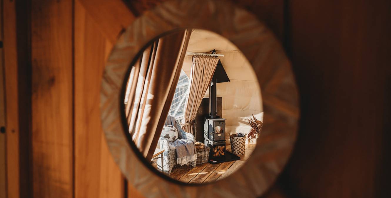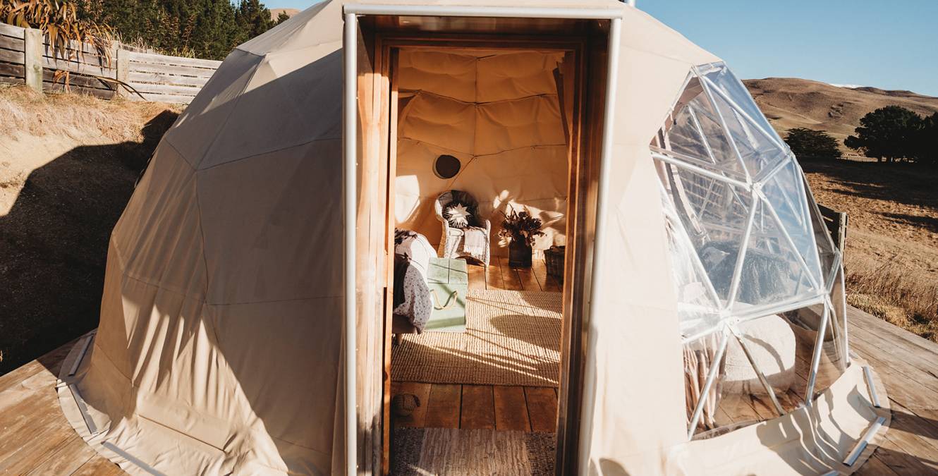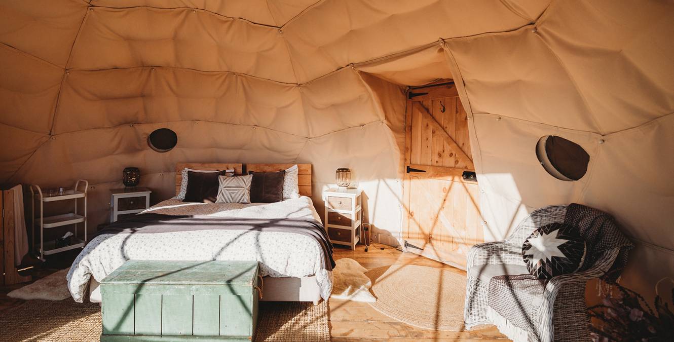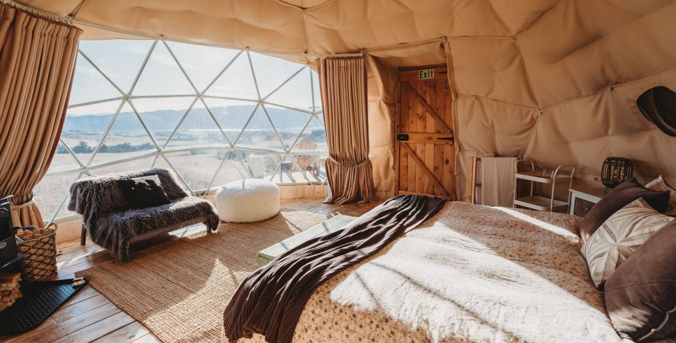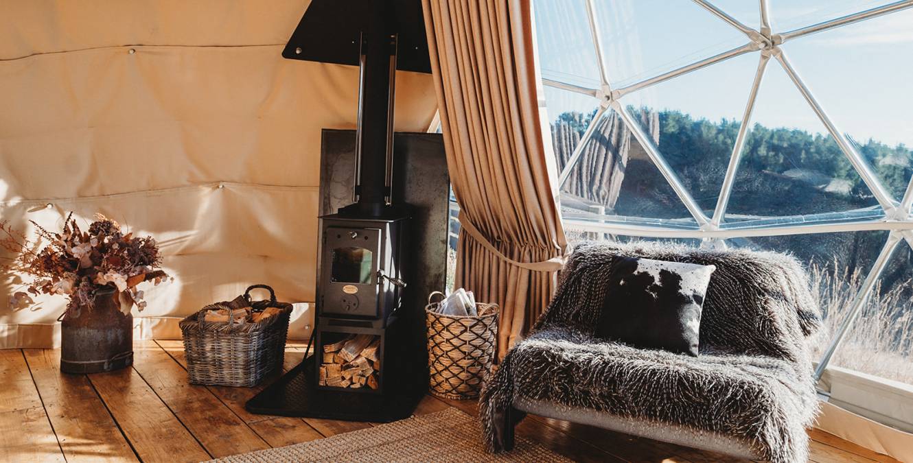 This Geodesic Dome tent is 6 metres in diametre with a large bay window in front with private views of the stunning scenery. A super-king sized bed with luxury down duvets and linen duvet covers, pure woollen blankets, seating, bedside tables, lighting, cell phone charger, and a private balcony. Large enough to fit an extra person comfortably. This dome also has an ensuite composting toilet and a wood fire for heating over the colder months (May to September). Price includes breakfast