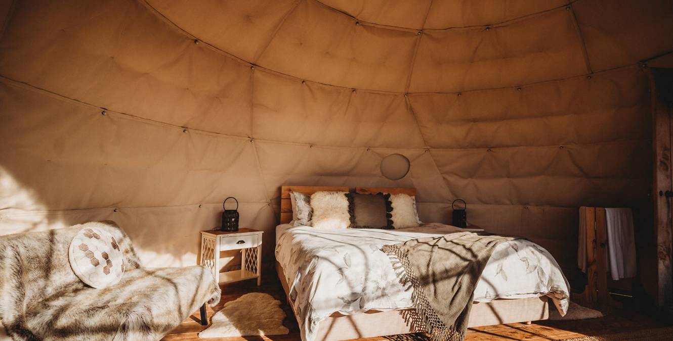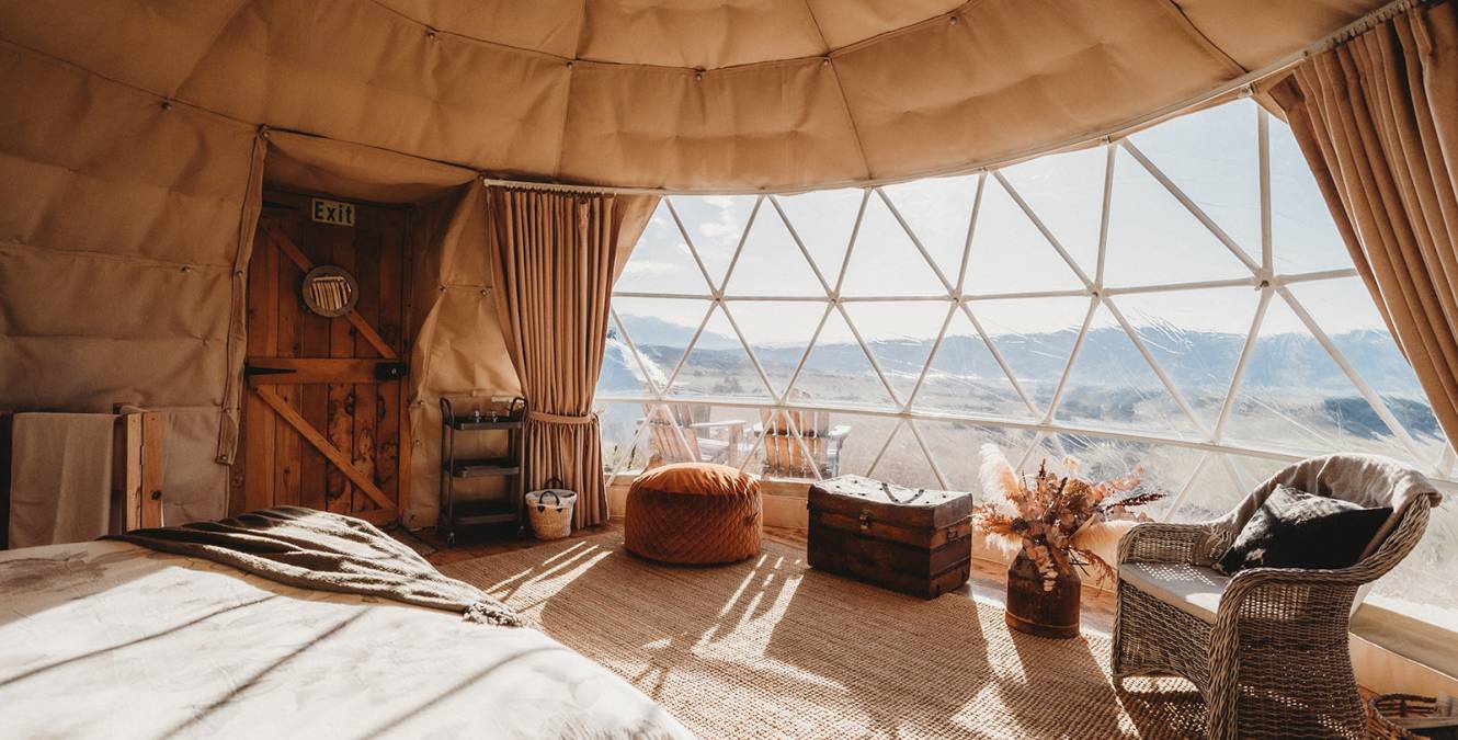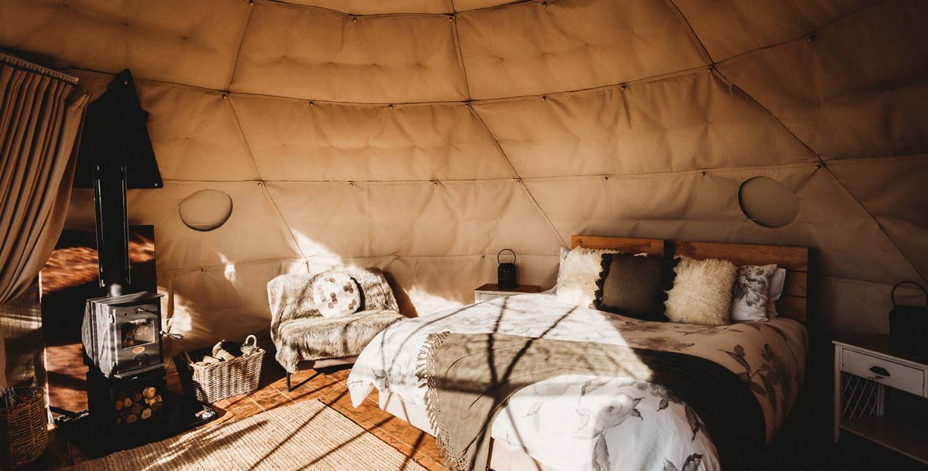 This Geodesic Dome is 6 metres in diametre with a large bay window in front with stunning views of the valley below and the mountains beyond. A super king-sized bed with luxury down duvets and linen duvet covers, pure woollen blankets, seating, bedside tables, lighting, cell phone charger, a private balcony, plus a small log burner for warmth during the winter months (May to September). Large enough to fit an extra two people in fold out beds. *Price includes breakfast*
