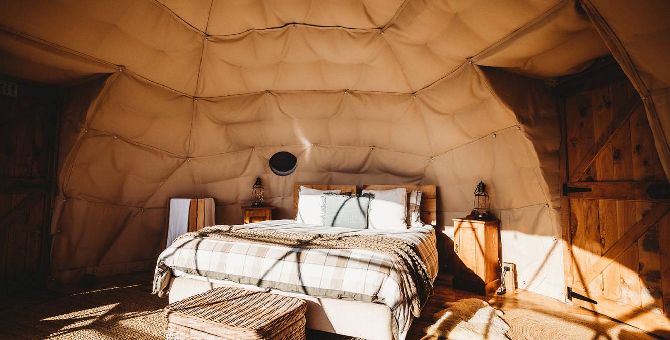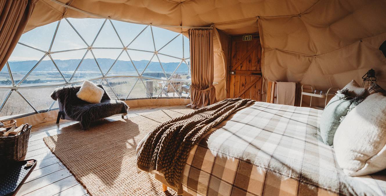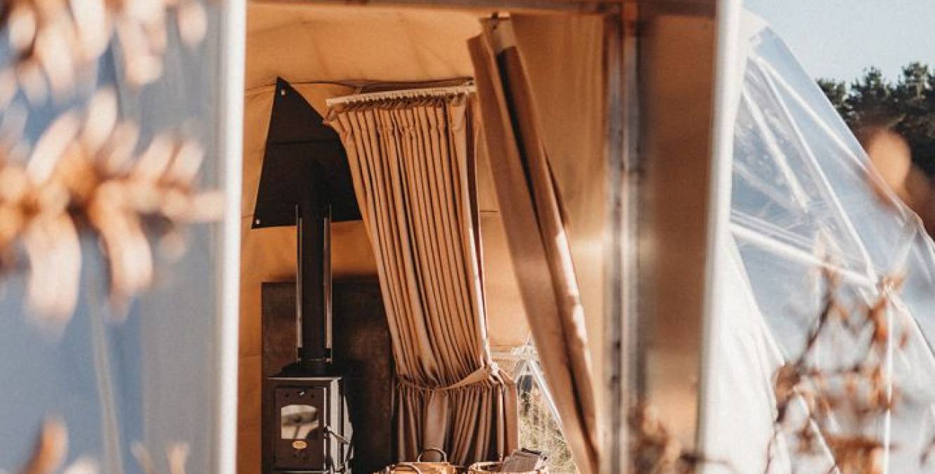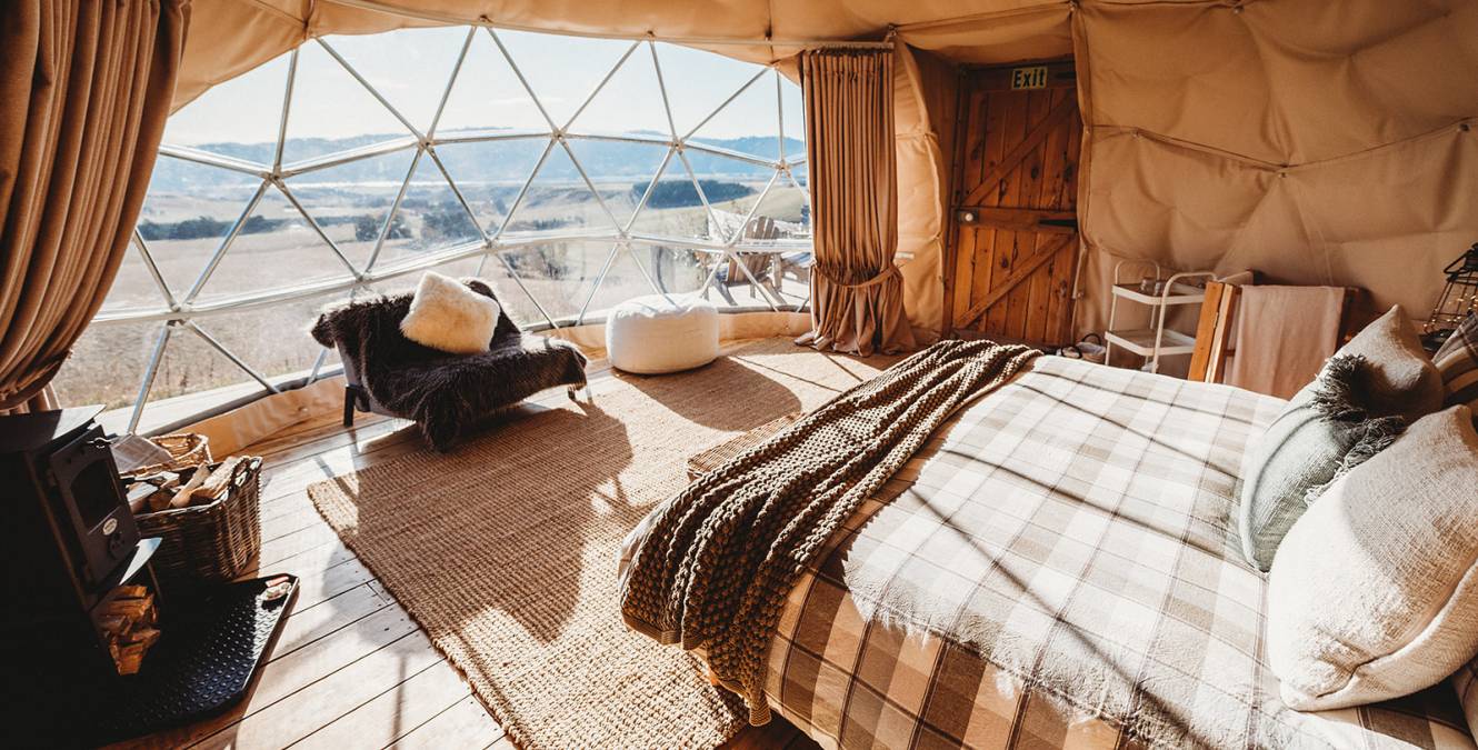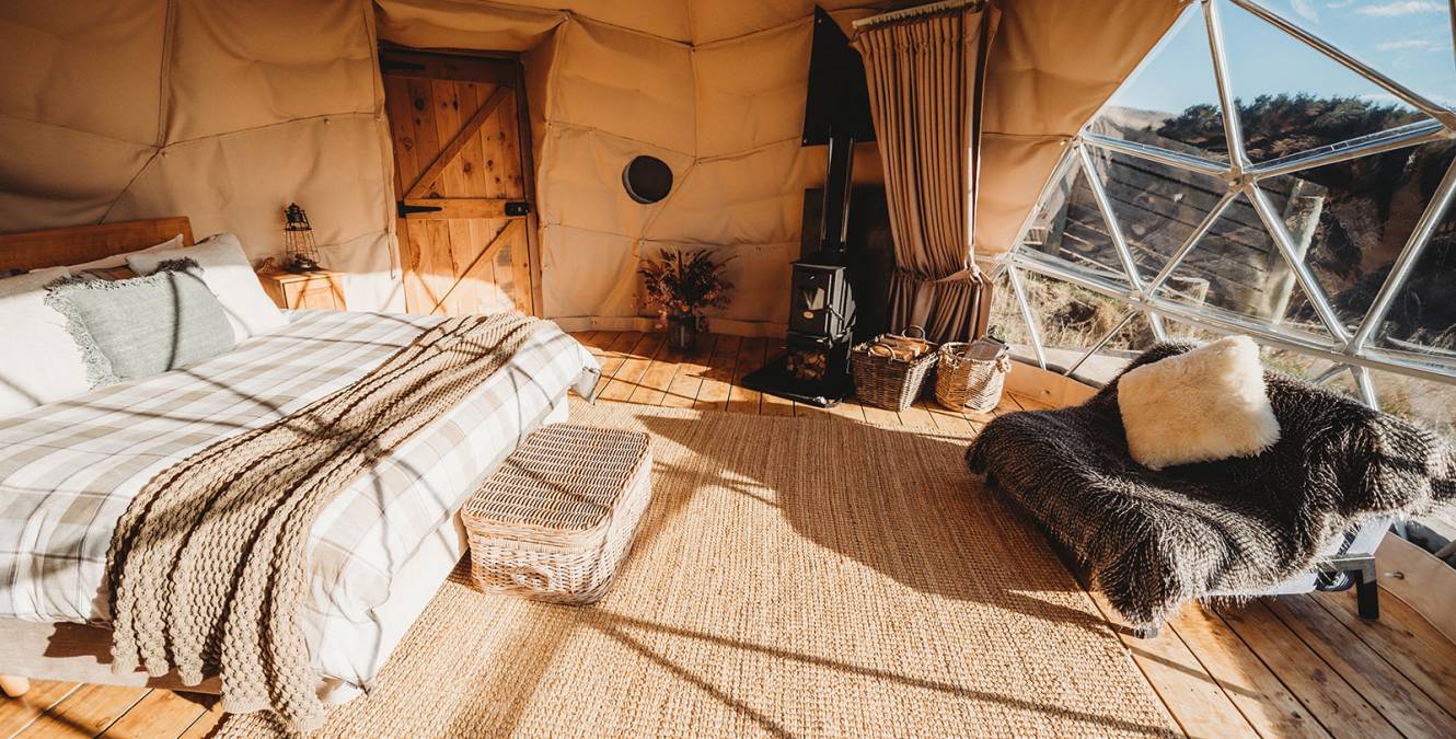 This Geodesic Dome tent is 6 metres in diametre with a large bay window in front with private views of the stunning scenery. A super-king sized bed which can be split to twin beds on request, with a luxury down duvet and linen duvet cover, pure woollen blankets, seating, bedside tables, lighting, cell phone charger, and a private balcony. It also has a fold out bed to sleep 1 extra person. A small log burner for use during winter months (May to September) keeps the dome toasty warm, and an ensuite composting toilet. *Price includes breakfast*